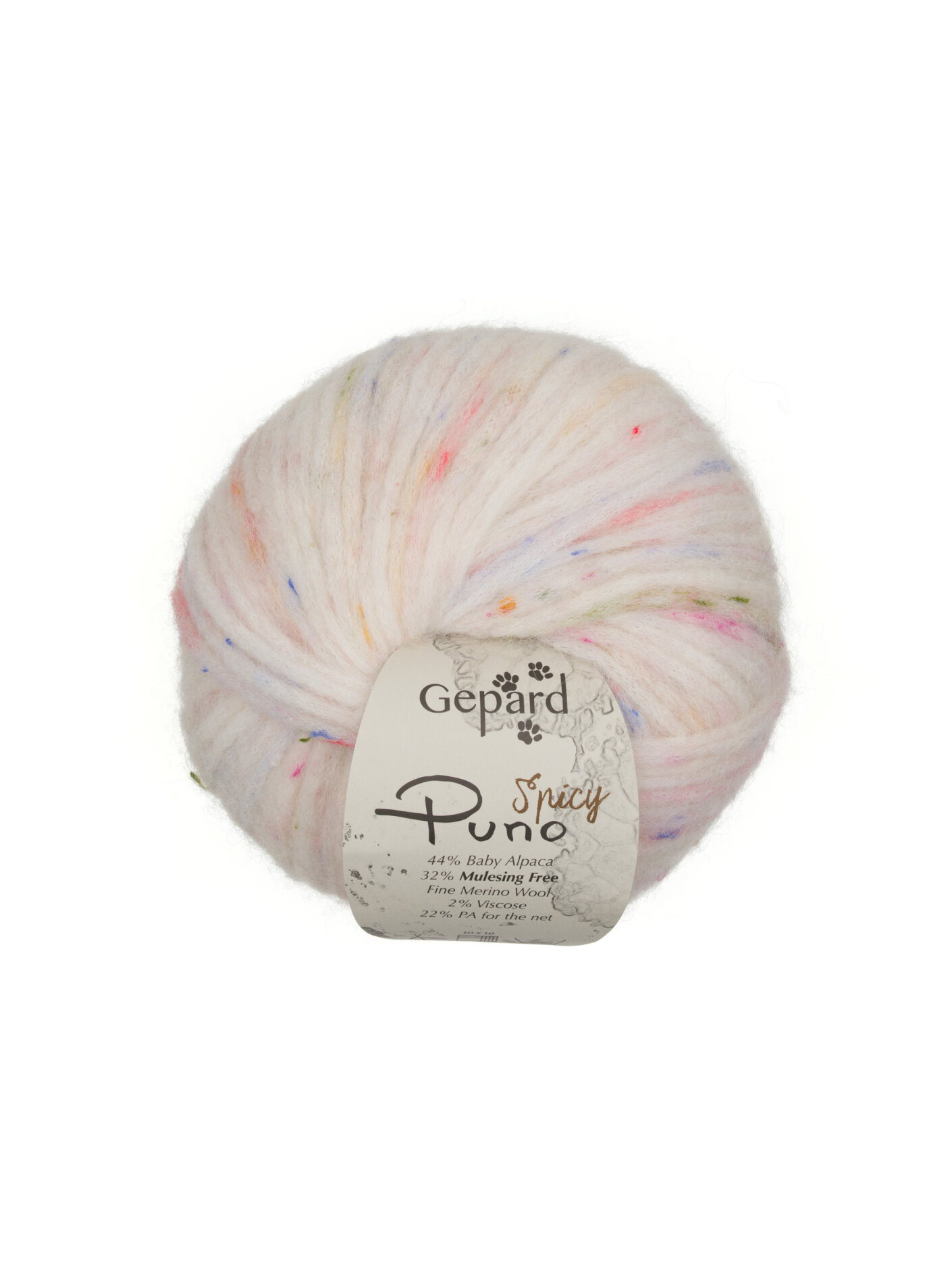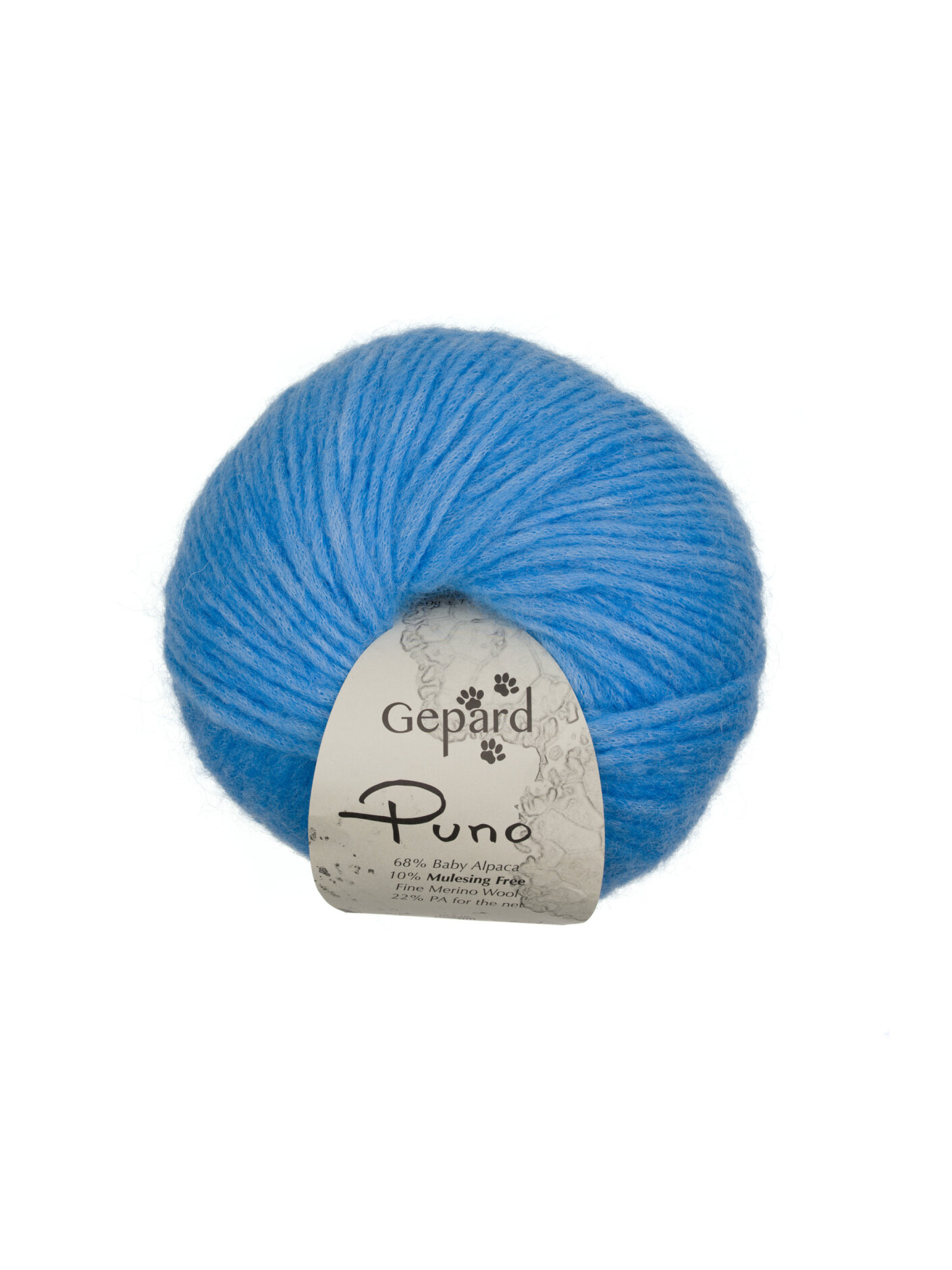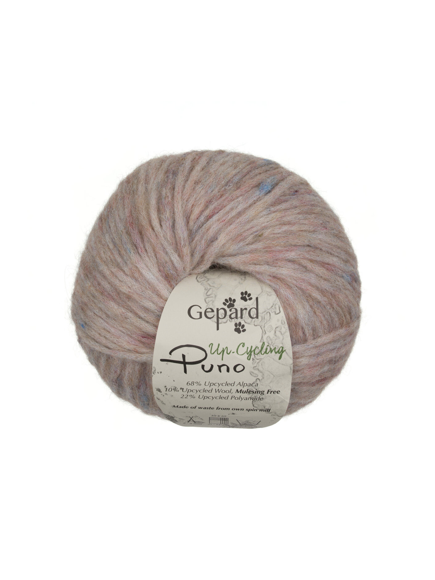 Puno er et såkaldt 'blowyarn' og består hovedsagelig af fineste bløde babyalpaca 68%, helt uden nogen stikhår og 10% merinould samt 22% nylon til et tyndt net. Fibrene blæses ind i nettet, som derved giver den luftige lethed som karakteriserer garnet.