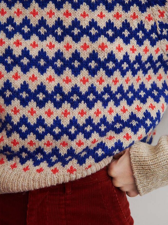 Inge Sweater har tydelig reference til 60ernes og 70ernes mønstre og formsprog - men også til endnu tidligere mønstertradition. Det gør Inge Sweater til en moderne klassiker, der er nem at sætte sit eget præg på i kraft af de farver, man strikker den i.