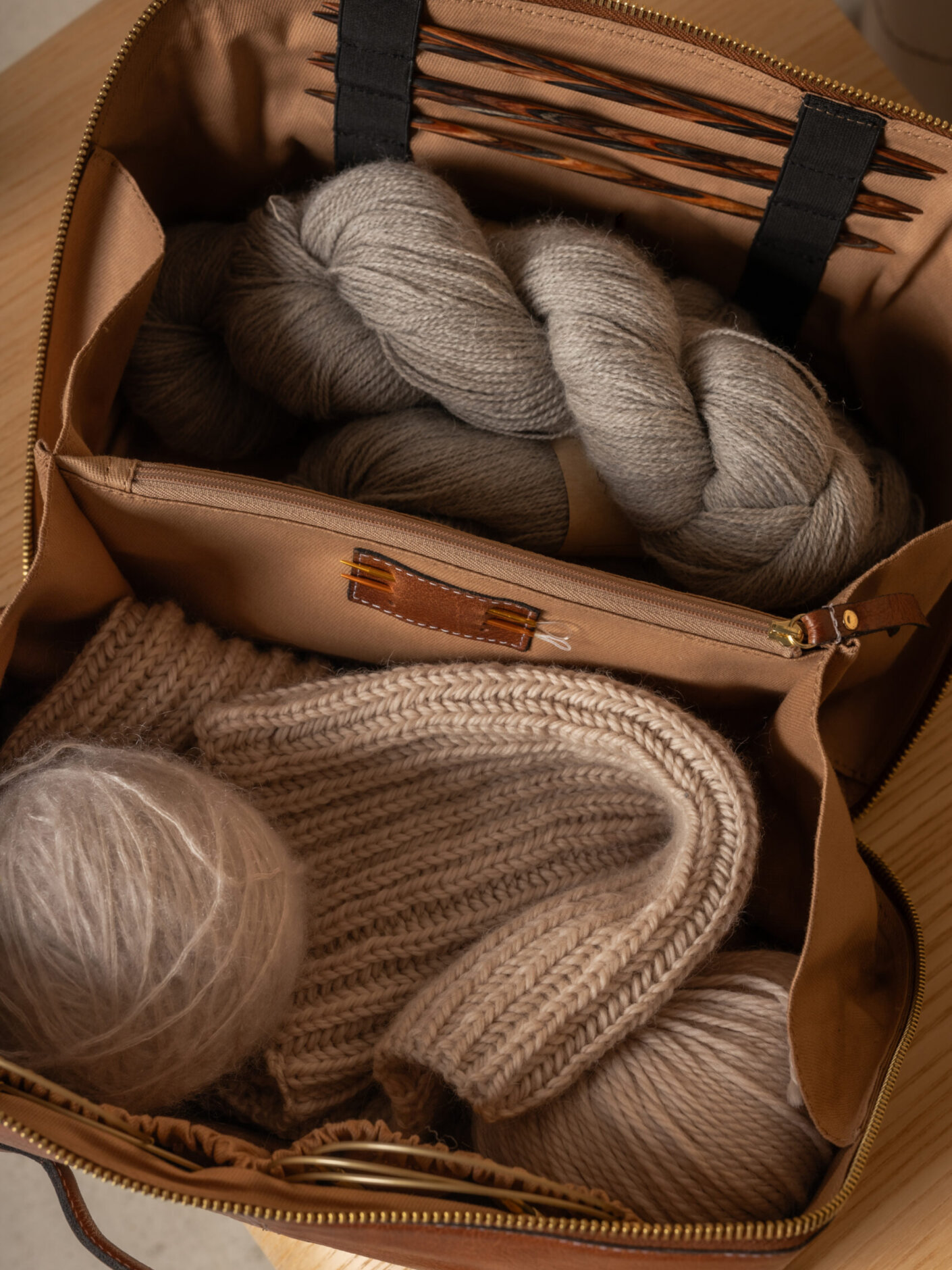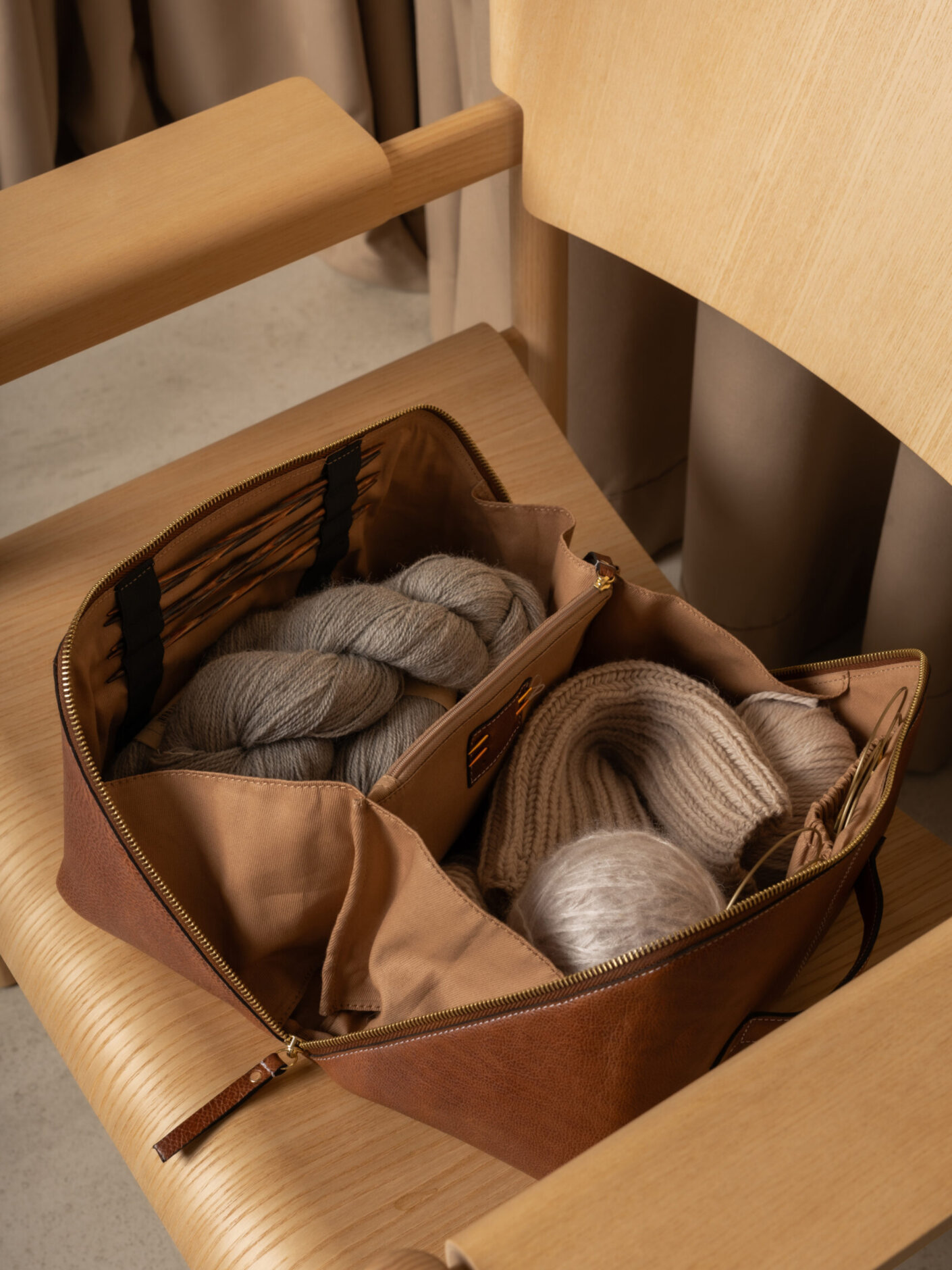 Her er både plads til både strikkepinde/hæklenåle, pindemåler, saks, garn og måske endda et projekt du har igang. Masser af lommer og rum, så du nemt kan organisere alle dine ting.