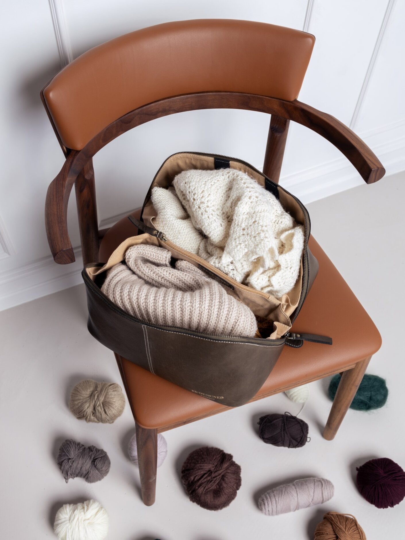 Designet er inspireret af en 'Beauty-Box', som er nem at få til at indeholde meget, nem at tage med, og praktisk i brug. Den er stabil, og står fint på gulvet, når du strikker.