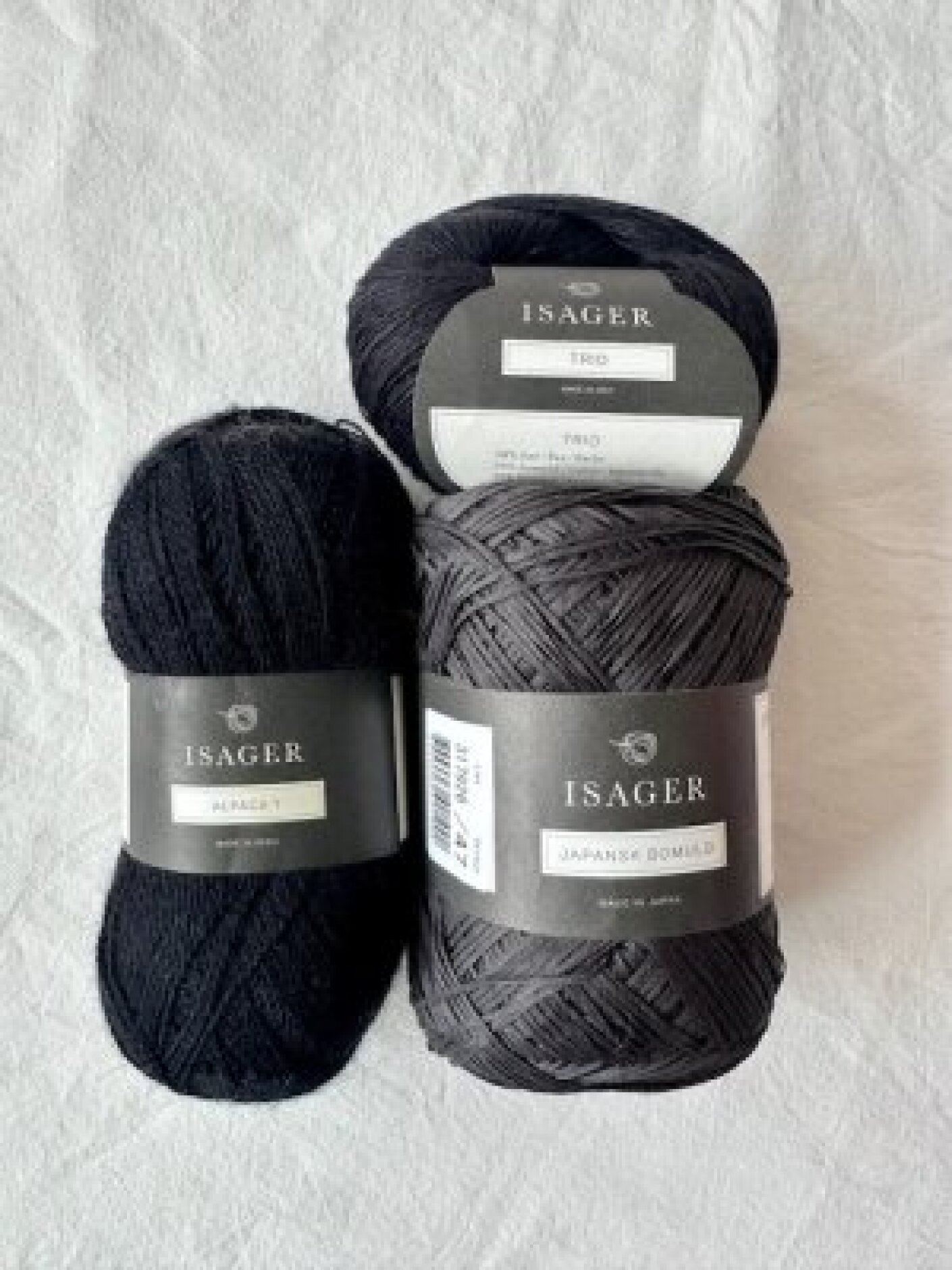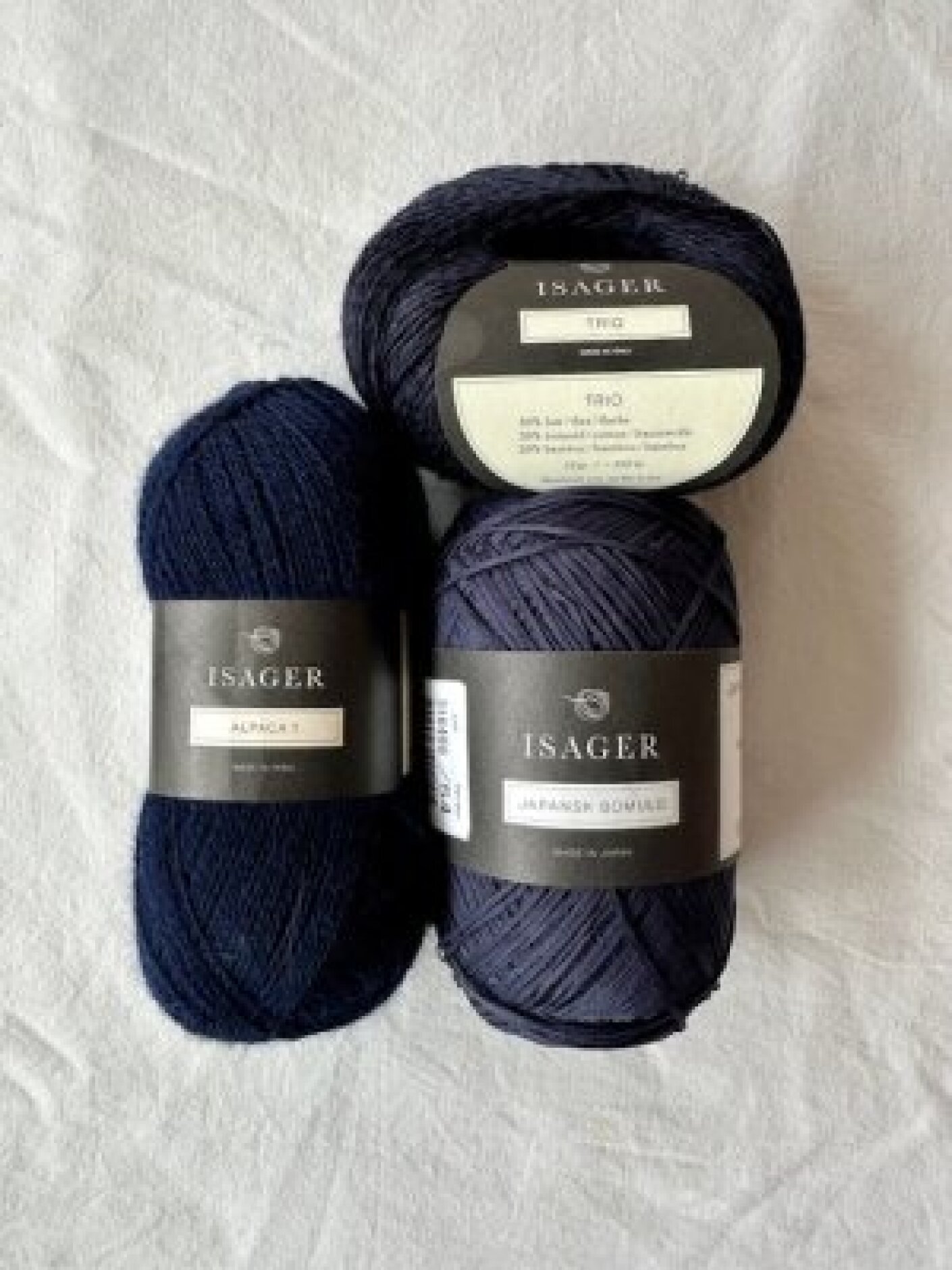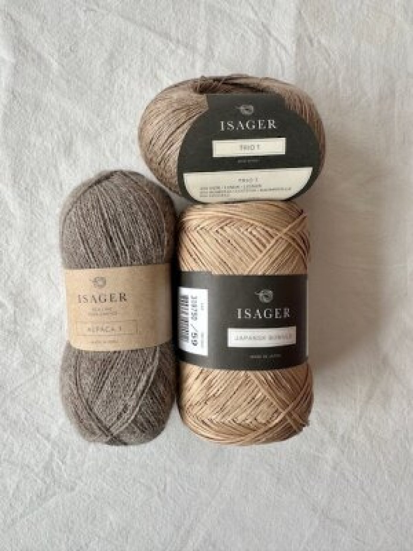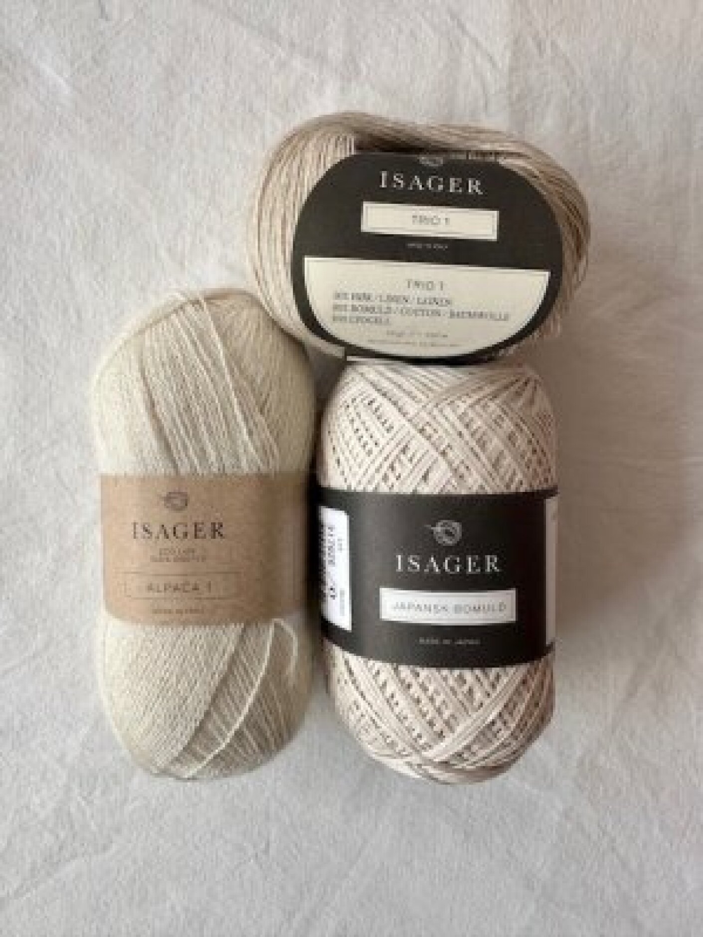 Kittet indeholder garn i valgt farve, til at strikke 'Yoreum Top'. Garnet er 'Trio', 'Japansk Bomuld' og 'Alpaca 1' fra Isager. Du kan vælge imellem flere farvekombinationer, som jeg har sammensat, hvoraf 'Linen' og 'Navy' svarer til de kombinationer afbildet i opskriften.
