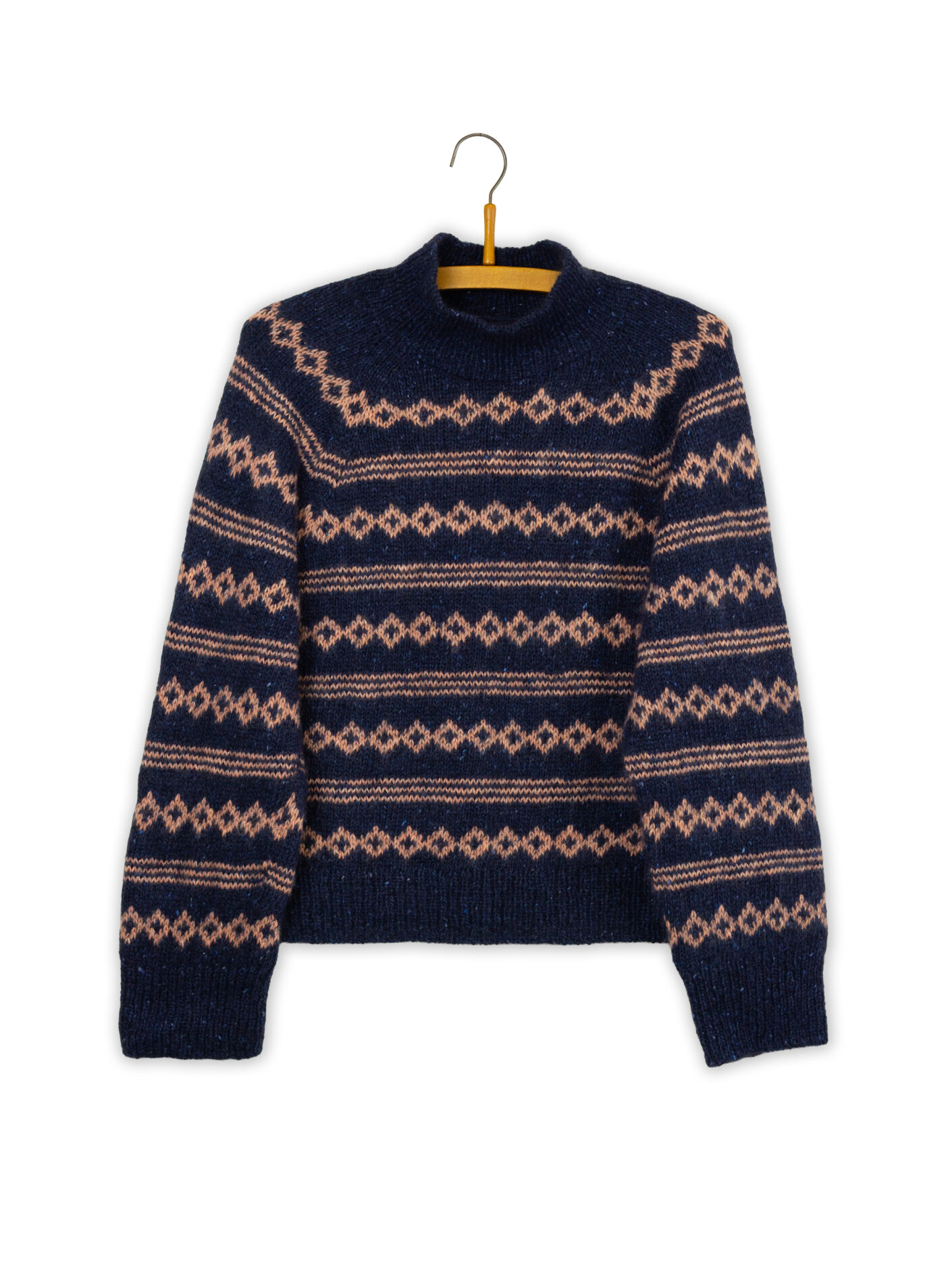 Garnet er Isager 'Tweed' fv. Navy kombineret med Isager 'Silkmohair' fv. 100 som bundfarve, og Isager 'Spinni' fv. 39S kombineret med Isager 'Silkmohair' fv. 62 som mønsterfarve.