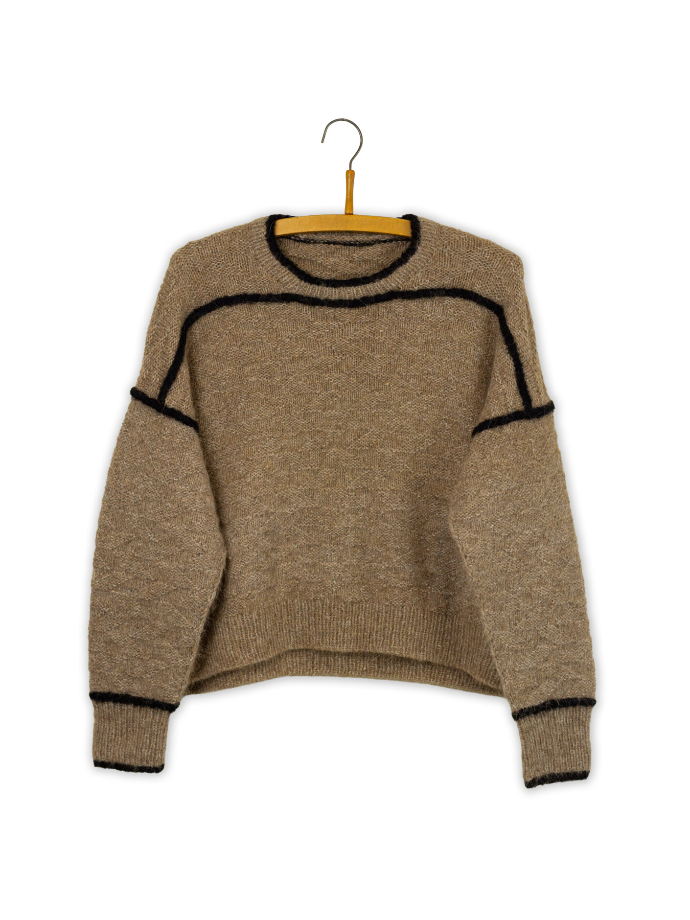 ZOE_LOOP_SWEATER strikkes oppefra og ned. Først slås masker op til rygstykket, som derefter strikkes frem og tilbage med vendepinde for at forme den øverste del af bagstykket. Herefter samles masker op langs skulderkanten, og skuldrene strikkes frem og tilbage hver for sig. De to skuldre samles til forstykket ved at slå masker op fortil. For- og bagstykket samles, og kroppen strikkes rundt og afsluttes med ribkant og italiensk aflukning. Halsmaskerne samles op i halsåbningen, og halskanten strikkes rundt i rib. Den afsluttes med kontrastfarve og italiensk aflukning. Ærmemaskerne samles op i ærmeåbningen, og ærmerne strikkes rundt, hvorefter de afsluttes med ribkanter og italiensk aflukning. Der strikkes bieser i kontrastfarve, integreret flere steder i arbejdet. Der strikkes mønster i ret- og vrangmasker efter diagram over hele sweateren.