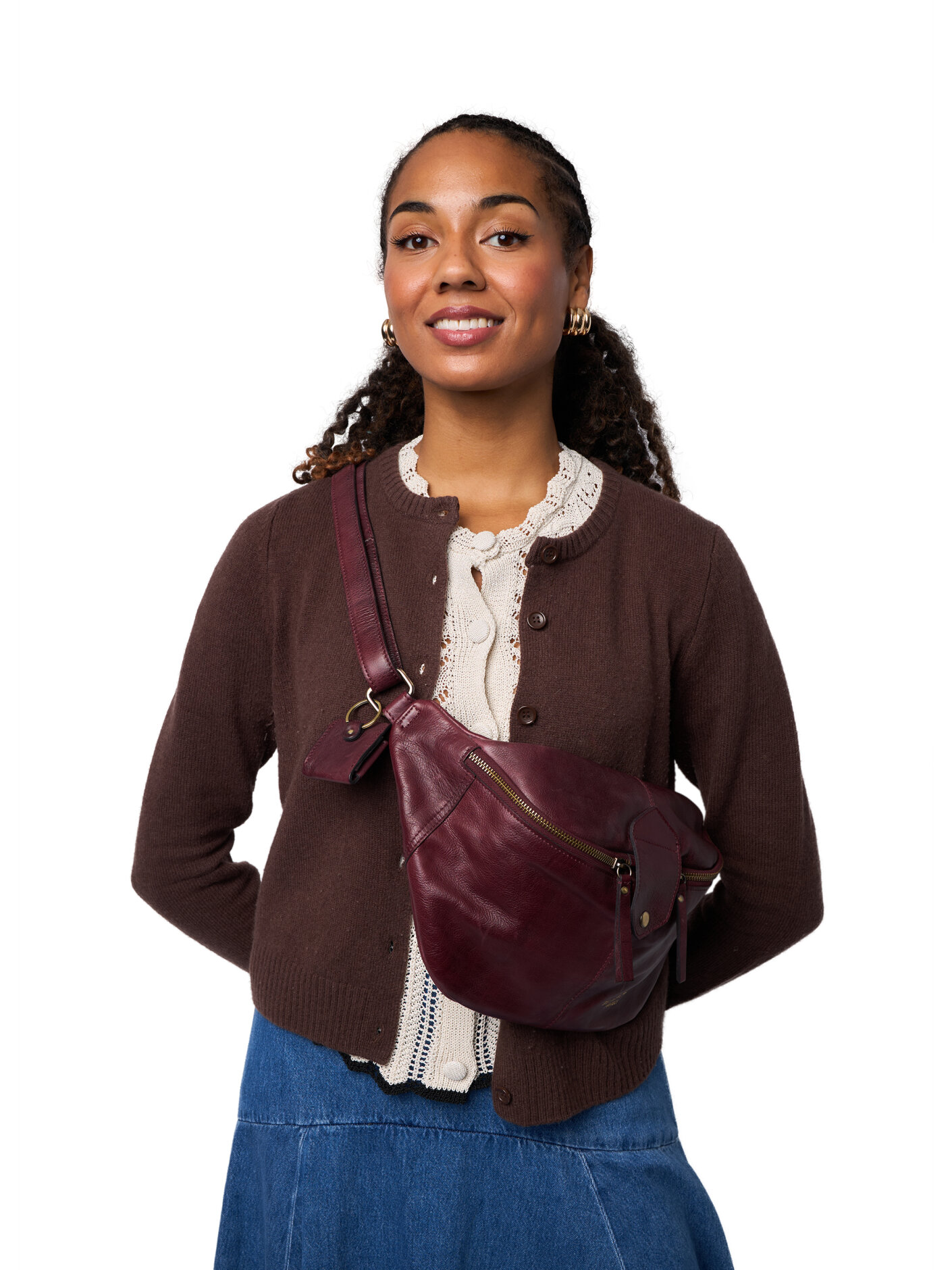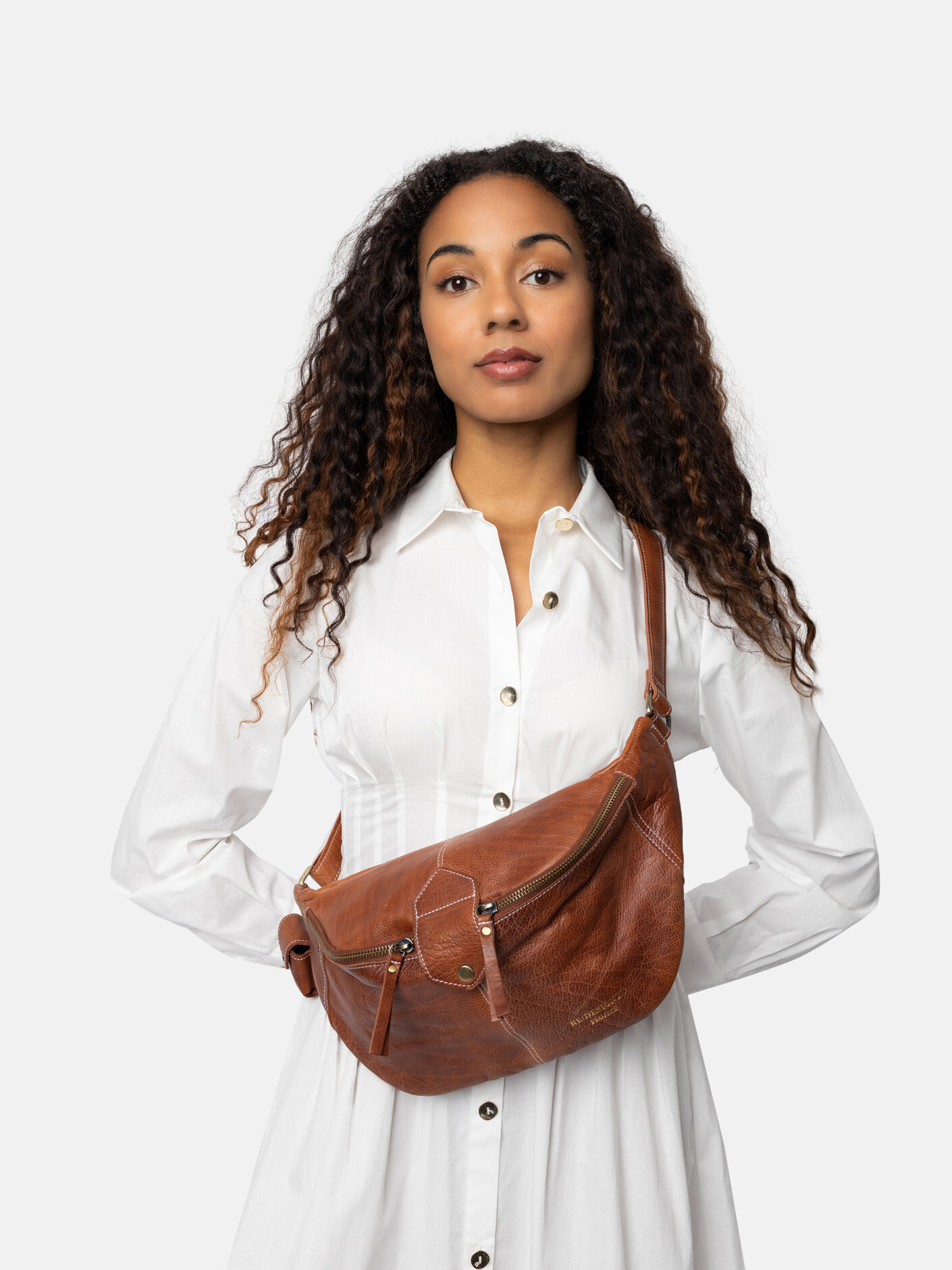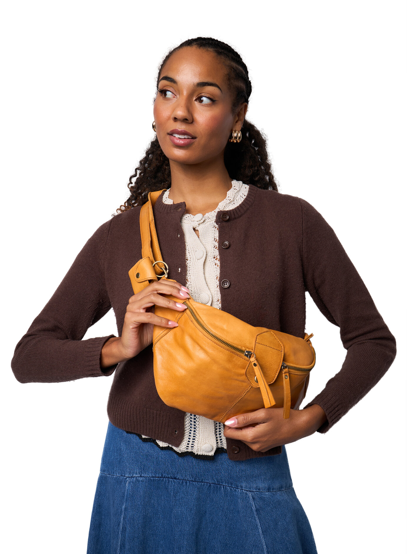 Tasken er designet i blødt Urban-læder og har et rummeligt design med to lynlåse, trykknap og en justerbar rem, så du kan bruge den både som crossbody og bumbag.