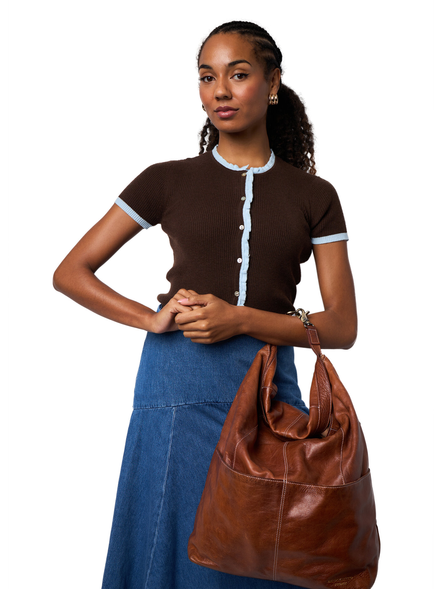 Denne proces bevarer læderets naturlige struktur og giver hver taske et unikt udtryk med individuelle særpræg, så ingen er helt ens.
