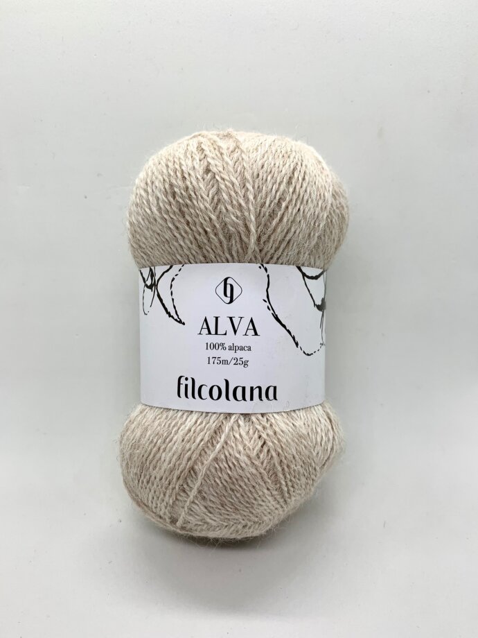 'Alva' er det fineste lille nøgle blødt alpacagarn, spundet af to tråde.\n\nGarnet fungerer rigtig godt som en tyndere følgetråd, dog er det ikke helt så tyndt som silkmohair, og derfor anvendes det særligt godt sammen med en tyndere uldtråd med en løbelængde på omkring 300m pr. 50g. Sammen med ex. 'Saga' fra Filcolana, vil den ramme ca. 21 masker pr. 10 cm. på en pind 4.