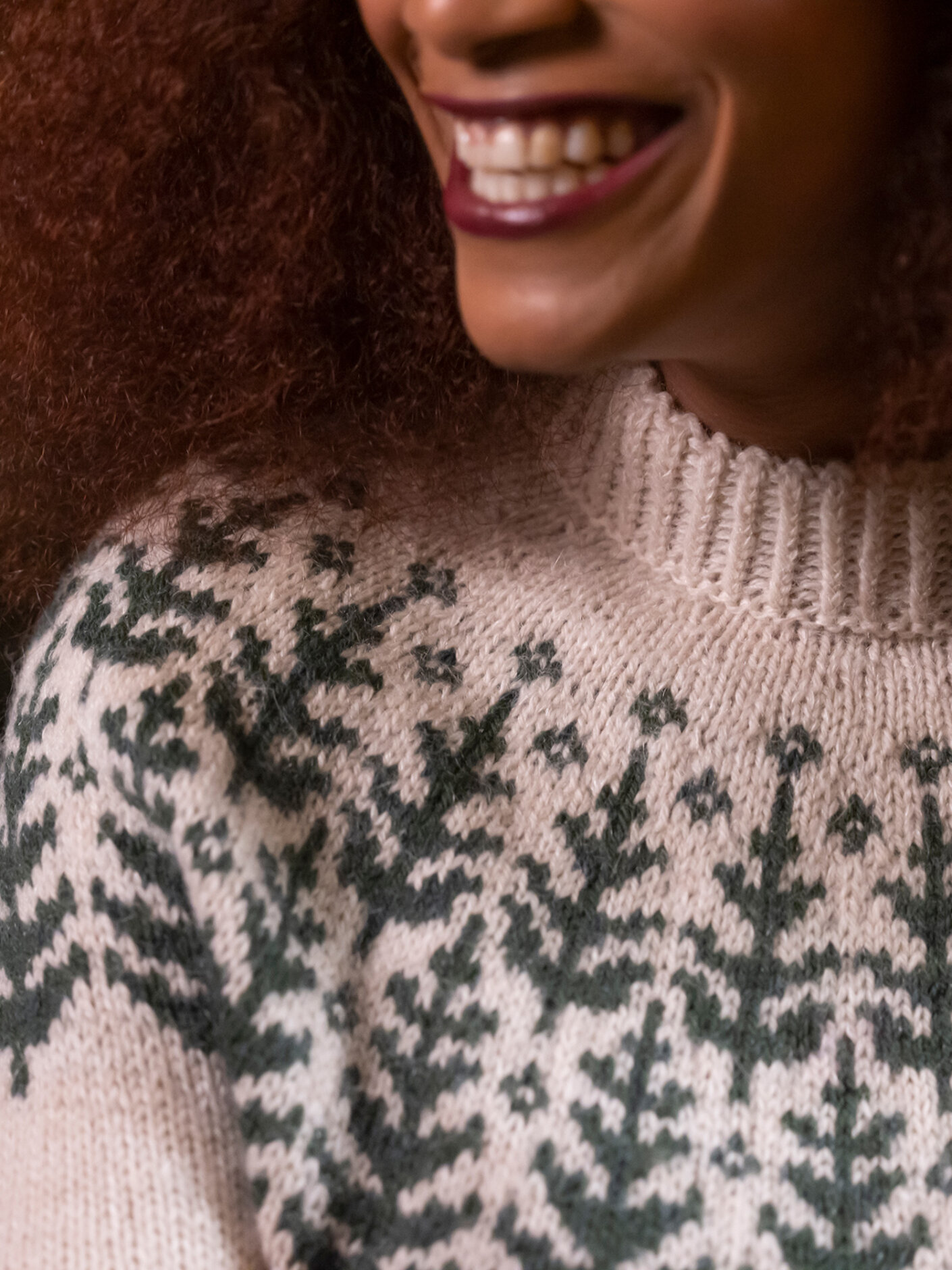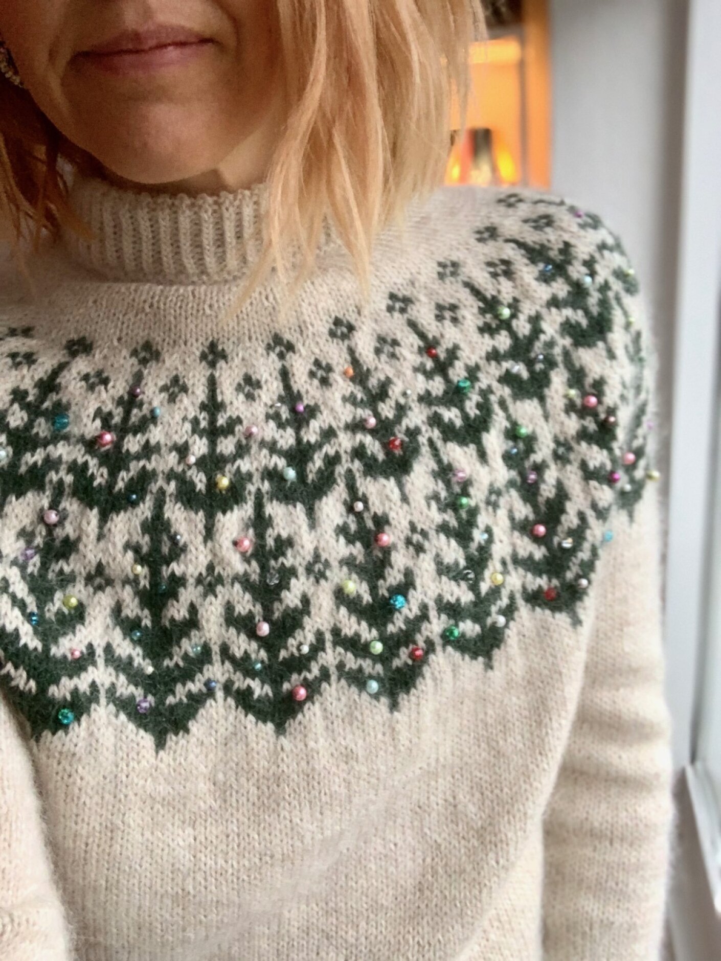 En anden mulighed er også at lave din sweater som en 'års-sweater' og dekorere ét nyt træ hvert år. Det kan fint gøres efterfølgende med både broderi og påsyning af perler.